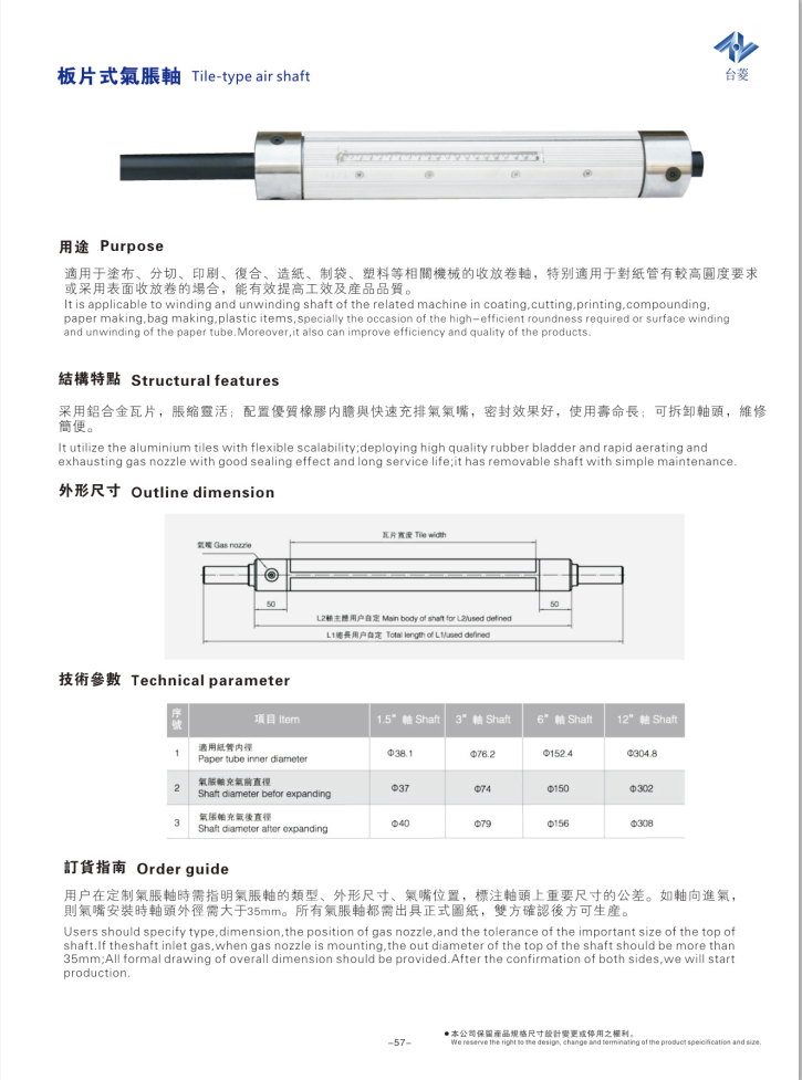 1、應用廣泛: 氣脹軸作為獨立設計的零件,從1英寸---12英寸,長短大小均由客戶實際需要確定,凡有分條、印刷、復卷、涂布、貼合、制袋、造紙等工為設備或其它相關中心卷取的機械,均可適用氣脹軸.