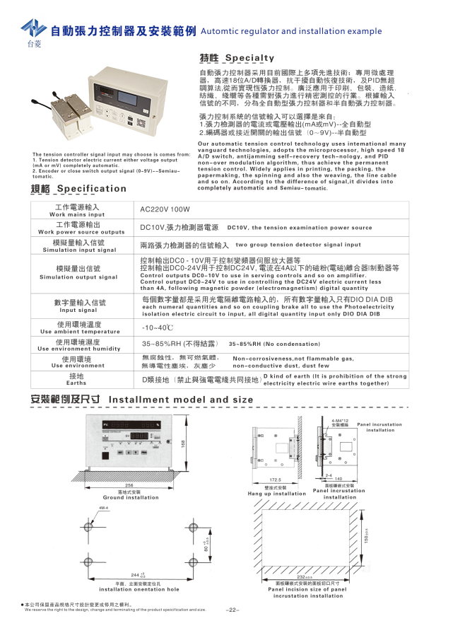 全自動張力控制器是一種高精度、多功能的全數字智能型張力控制器,配合張力檢測器組成閉環張力控制系統。通過接收張力檢測器傳送的信號,經內部PID運算處理后,調節執行機構,自動控制材料的收/放卷張力。全自動張力控制器采用全新的圖形液晶顯示器,中、英文顯示更清晰,并針對磁粉離合器/制動器發出0~24VDC的控制電壓指令,也可輸出0~10V電壓信號控制變頻器、伺服電機或其他執行機構對卷料進行高精度的張力控制。